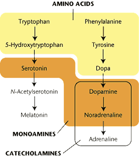 Amino acids- the precursors of the monoamine neurotransmitters are amino acids found in our foods. For the catecholamines dopamine and noradrenaline, the precursors are phenylalanine and tyrosine—in that order in the biosynthetic pathway. Tyrosine could be taken as a supplement—so why is phenylalanine preferred instead? Because tyrosine does not provide the same uplifting benefits as phenylalanine, which is required for the production of a metabolite, phenylethylamine, whose mood-elevating properties augment those of noradrenaline.
